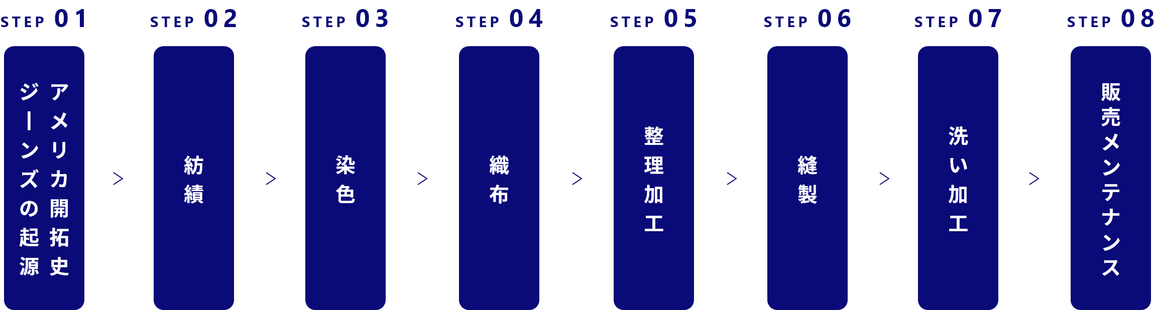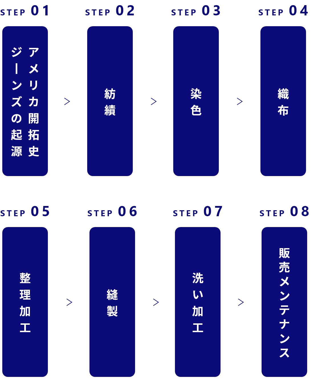ジーンズの基礎知識として、ジーンズのモノづくりの基本となる製造過程に重きをおいた素材・縫製・洗い加工の特徴等の学習をします。また、原綿から糸・生地・縫製品・加工品(商品)と流通から販売までも記載があります。